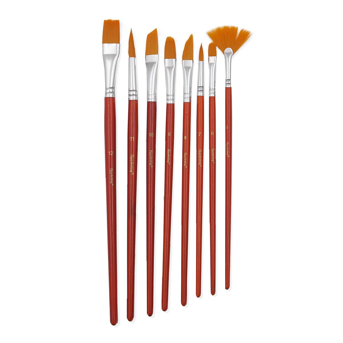 В набор входят кисти: плоская прямая, плоская скошенная (2 шт.), веерная, овальная (2 шт.), лайнер, круглая с острым концом.