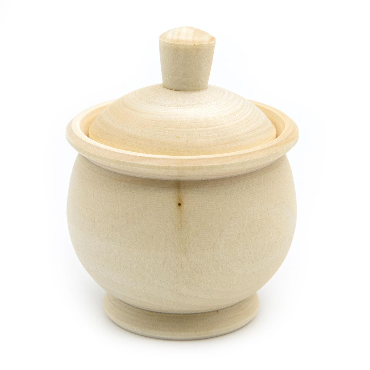 Заготовка сахарницы с крышкой из цельной древесины (липа). Дерево – экологичный и неприхотливый в работе материал. Сахарницу можно расписать яркими акриловыми красками, покрыть лаком – глянцевым, матовым или с эффектом кракелюр, оформить технике декупажа либо обработать воском для создания винтажного эффекта и защиты от влаги.