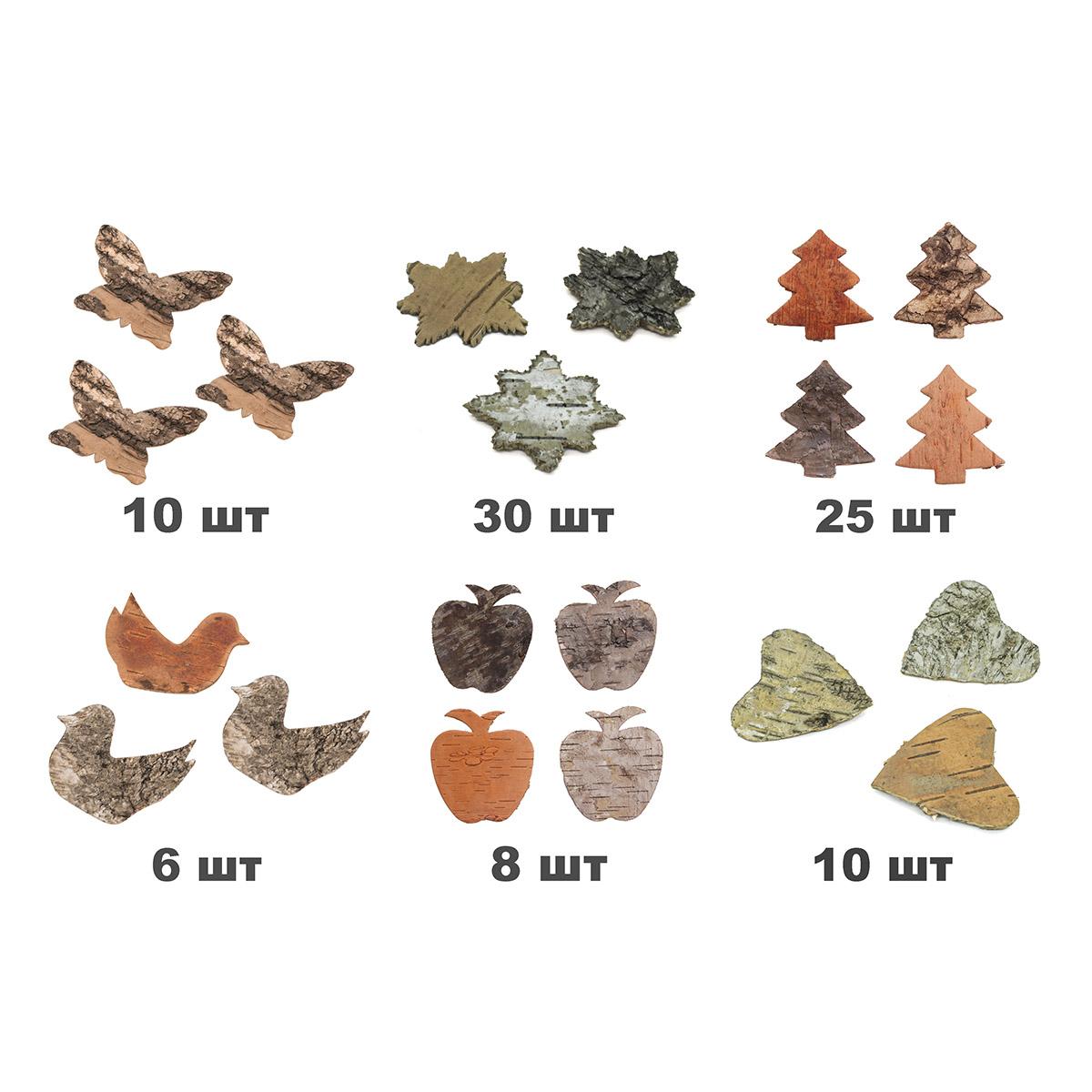 В состав набора входят шесть видов декоративных элементов из коры дерева, каждый из которых имеет свою уникальную текстуру и цвет: декоративные элементы из коры дерева Елочка (25 шт/уп.), декоративные элементы из коры дерева Яблоко (8 шт/уп.), декоративные элементы из коры дерева Птичка (6 шт/уп.), декоративные элементы из коры дерева Сердце (10 шт/уп.), декоративные элементы из коры дерева Бабочки (10 шт/уп.), декоративные элементы из коры дерева Восьмиконечная звезда (30 шт/уп.).