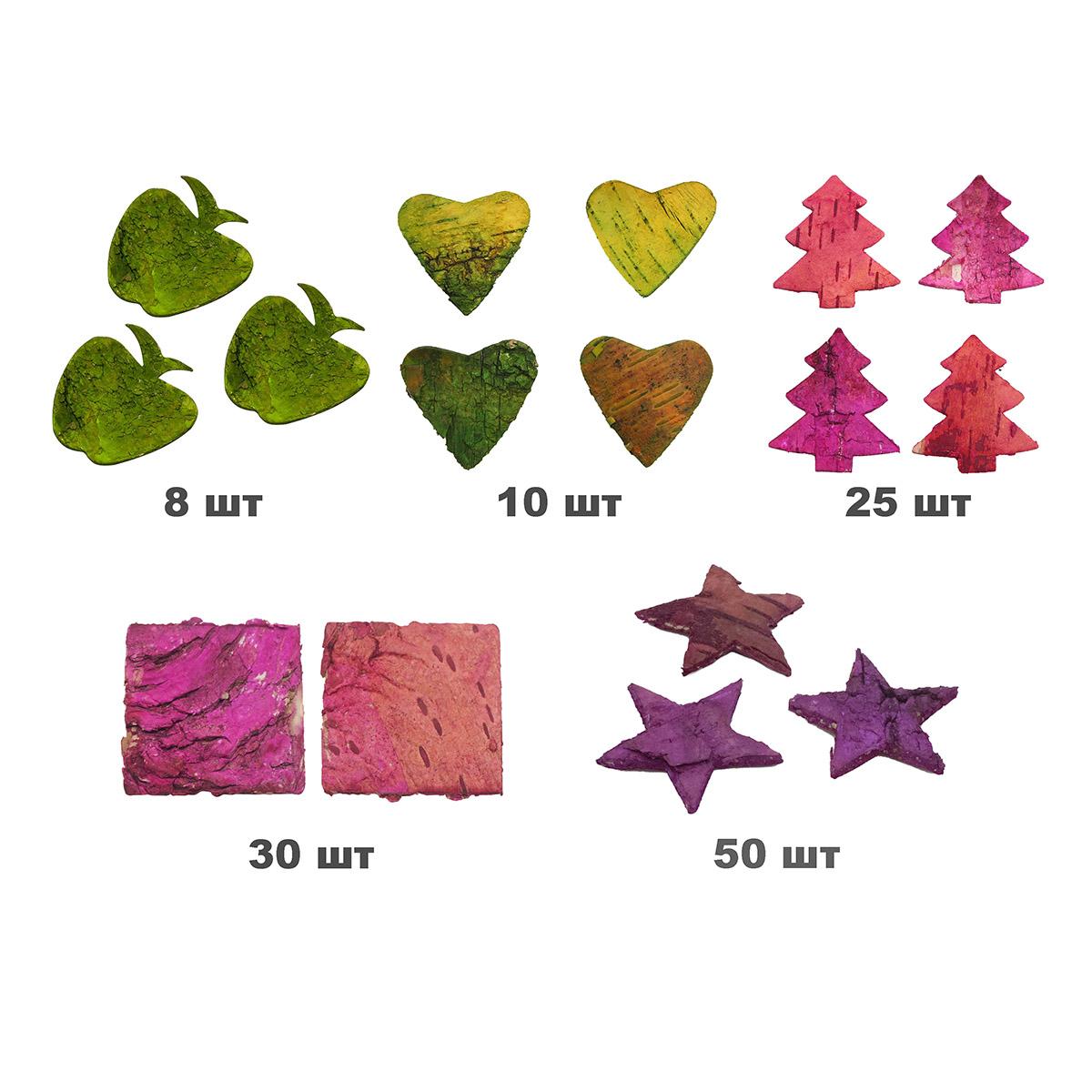 В состав набора входят пять видов декоративных элементов из коры дерева, каждый из которых имеет свою уникальную текстуру и цвет: декоративные элементы из коры дерева Яблоко (8 шт/уп.), декоративные элементы из коры дерева Елочка (25 шт/уп.), декоративные элементы из коры дерева Звездочки (50 шт/уп.), декоративные элементы из коры дерева Сердце (10 шт/уп.), декоративные элементы из коры дерева Квадратики (30 шт/уп.).