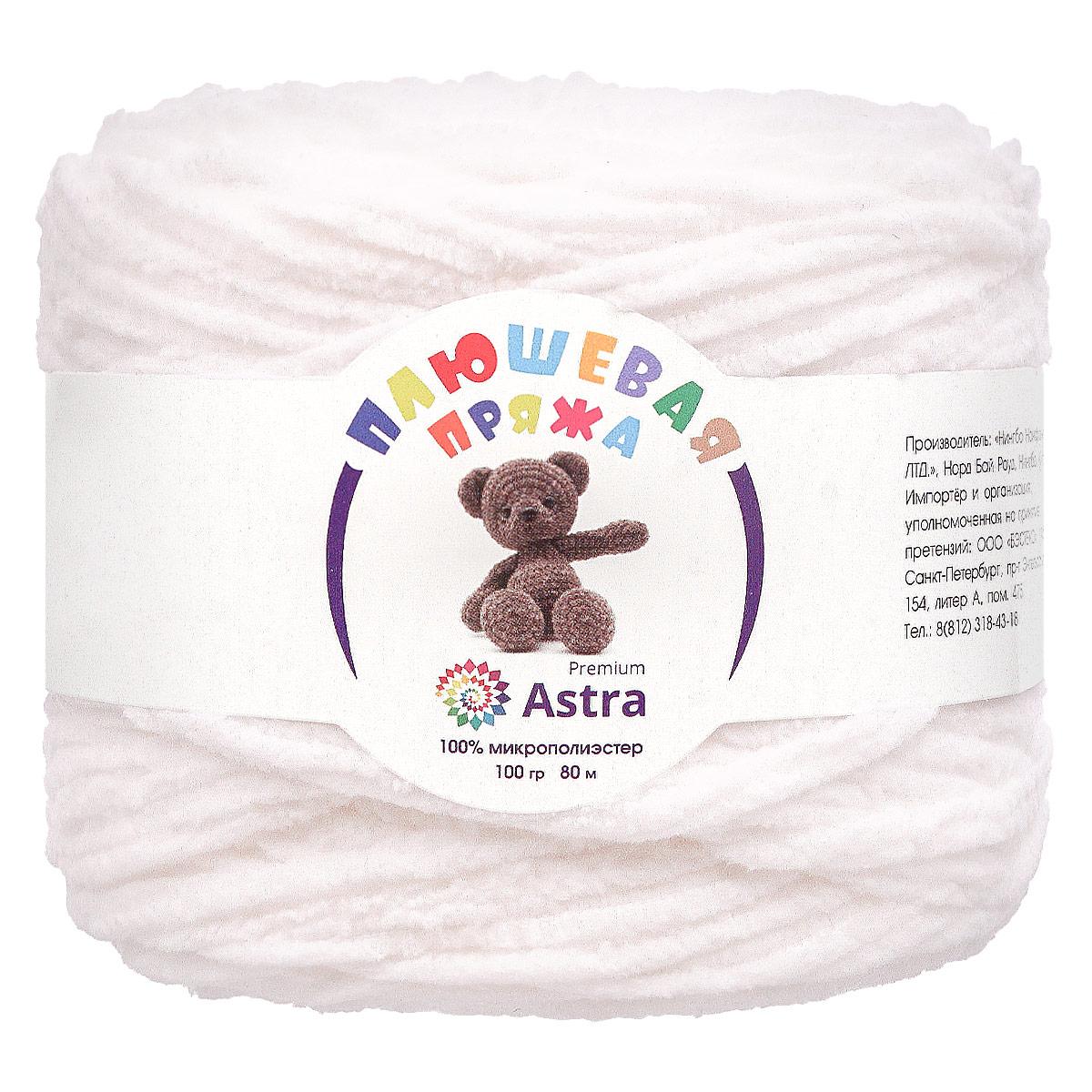 Плюшевая' от Astra Premium – пряжа тончайшим пушистым ворсом, который придает вещам мягкость и объем. Нить изготовлена 100% микрополиэстера, этот материал не раздражает кожу, сохраняет форму и цвет длительное время.