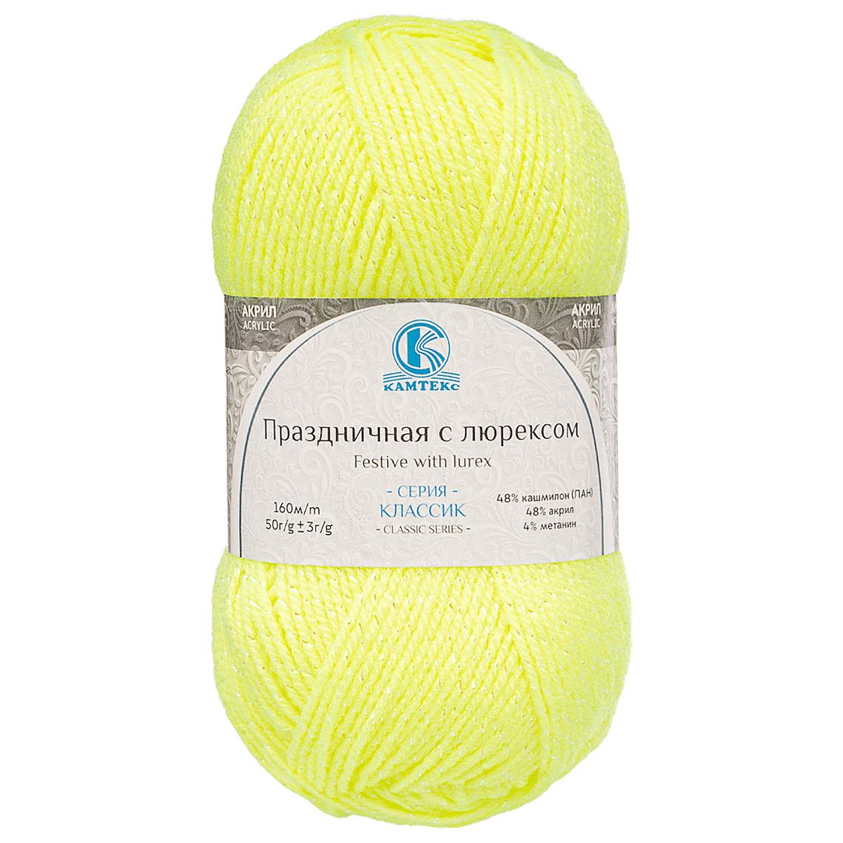 Праздничная с люрексом' от 'Камтекс' идеально подходит для вечерних нарядов – кардиганов, платьев, шалей. Пряжа отличается обилием расцветок, на любой вкус – от яркой неоновой до сдержанной светло-бежевой. Смесь кашмилона я акрила оплетена люрексом, нить имеет легкий пушок и после влажной тепловой обработки не меняет свой вид. Подходит для новичков. Лицевая гладь получается ровно, полотно не косит. Кашмилон в составе пряжи исключает образование катышков, а метанитовые нити придают готовым изделиям праздничный блеск. Обратите внимание: люрексовая нить почти не колется, но вещи с таким материалом не стоит надевать на голое тело – они могут вызывать раздражение. Используйте подкладочную ткань или носите изделия из этой пряжи поверх другой одежды.