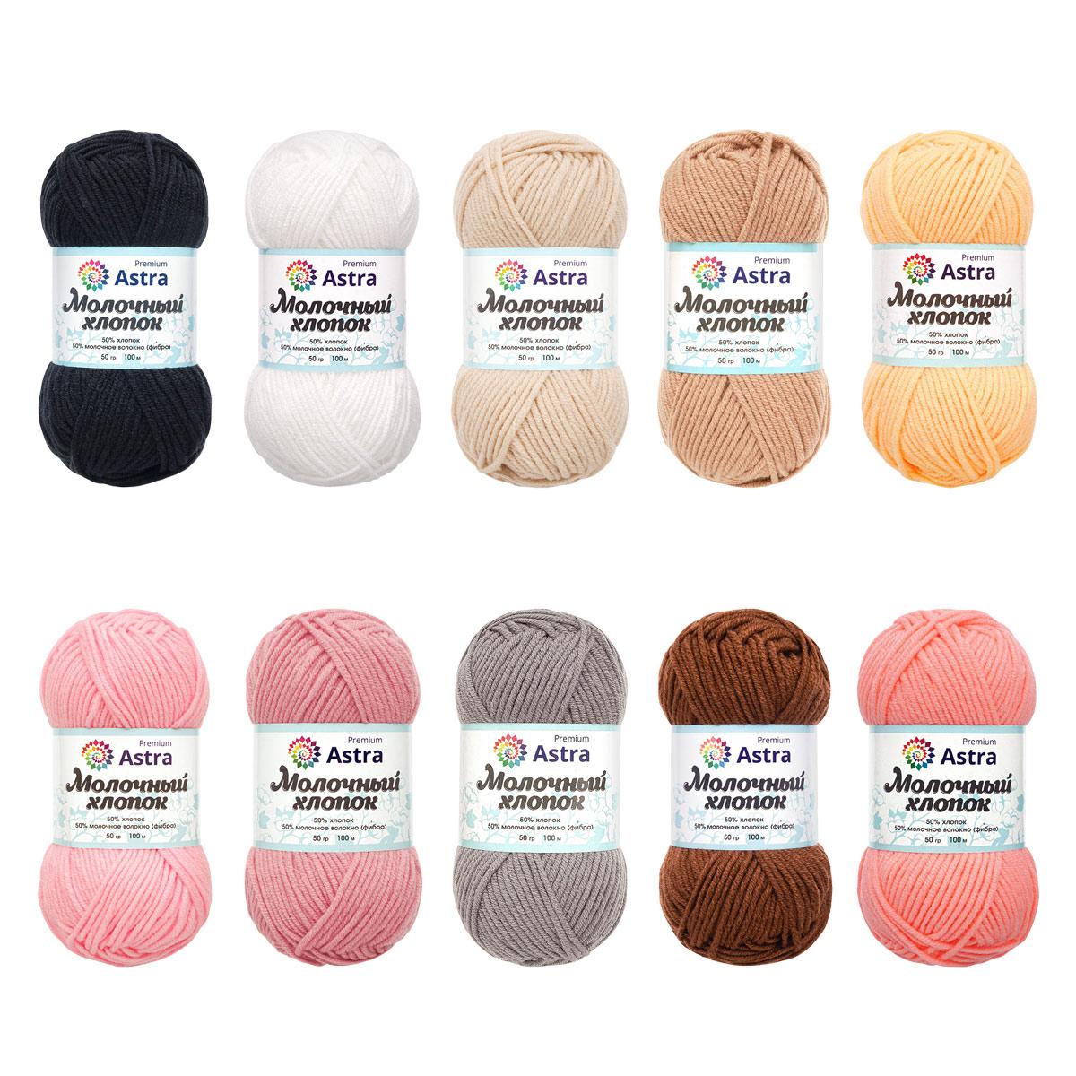 Готовый набор мягкой летней пряжи от Astra Premium 'Молочный хлопок' (Milk Cotton) с необычным составом. На 50% она состоит из молочного акрила – этот материал получают из продуктов молочного производства, обрабатывают и вытягивают в нити. Получается легкое объемное волокно. Для прочности молочный акрил смешивают с другими волокнами. Мы добавили хлопок, и получилась очень мягкая пряжа с небольшим блеском.