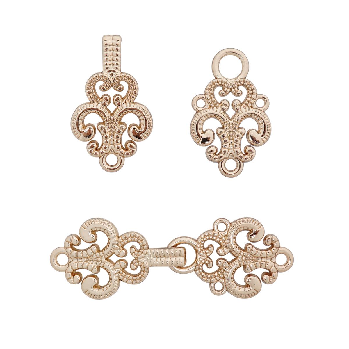 Застежка-крючок с просечным декором для разных типов изделий. Материал – металл (штампованный лист), цвет – олово (серый металлик). Застежка этого типа, украшенная в 'викторианском' стиле, обеспечит прочное соединение за счет крепления в 4 точках и станет заметной деталью готовой вещи. Сочетание многочисленных декоративных элементов и оригинального приглушенного цвета – то что нужно, чтобы вписать фурнитурную деталь в самые разные проекты: от консервативного ретро до свободного бохо или урбан джипси.