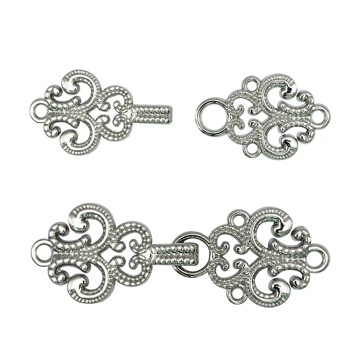 Застежка-крючок с просечным декором для разных типов изделий. Материал – металл (штампованный лист), цвет – олово (серый металлик). Застежка этого типа, украшенная в 'викторианском' стиле, обеспечит прочное соединение за счет крепления в 4 точках и станет заметной деталью готовой вещи. Сочетание многочисленных декоративных элементов и оригинального приглушенного цвета – то что нужно, чтобы вписать фурнитурную деталь в самые разные проекты: от консервативного ретро до свободного бохо или урбан джипси.