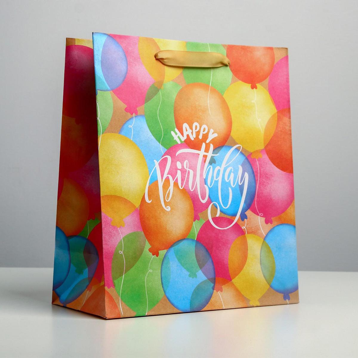 Дизайнерское оформление пакета с надписью Happy birthday поможет выделить презент среди других и продемонстрирует ваш вкус.
