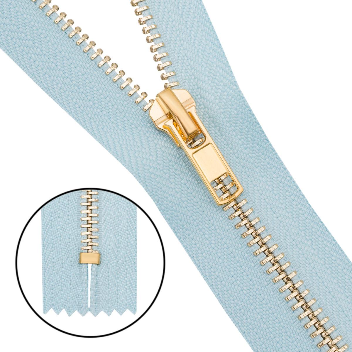 Металлические звенья золотого цвета отличаются долговечностью, сохраняют свой цвет и не подвержены коррозии. Они создают элегантный контраст с цветом тесьмы. Звенья обеспечивают надежное сцепление и плавный ход бегунка, предотвращая заедания и поломки. Слайдер надежно фиксирует звенья в сомкнутом положении, что особенно важно для застежек на юбках и брюках.