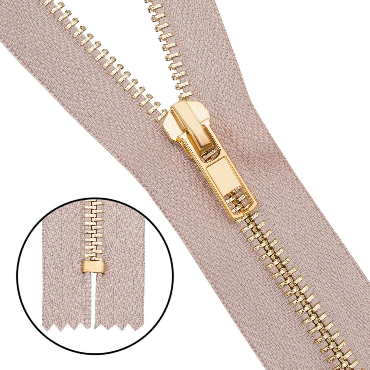 Металлические звенья золотого цвета отличаются долговечностью, сохраняют свой цвет и не подвержены коррозии. Они создают элегантный контраст с цветом тесьмы. Звенья обеспечивают надежное сцепление и плавный ход бегунка, предотвращая заедания и поломки. Слайдер надежно фиксирует звенья в сомкнутом положении, что особенно важно для застежек на юбках и брюках.