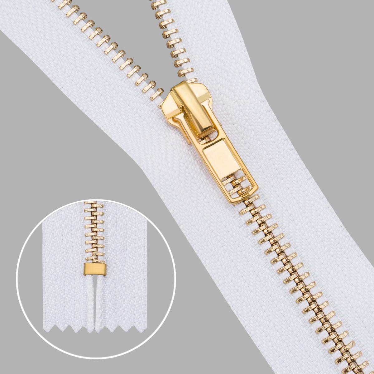 Металлические звенья золотого цвета отличаются долговечностью, сохраняют свой цвет и не подвержены коррозии. Они создают элегантный контраст с цветом тесьмы. Звенья обеспечивают надежное сцепление и плавный ход бегунка, предотвращая заедания и поломки. Слайдер надежно фиксирует звенья в сомкнутом положении, что особенно важно для застежек на юбках и брюках.
