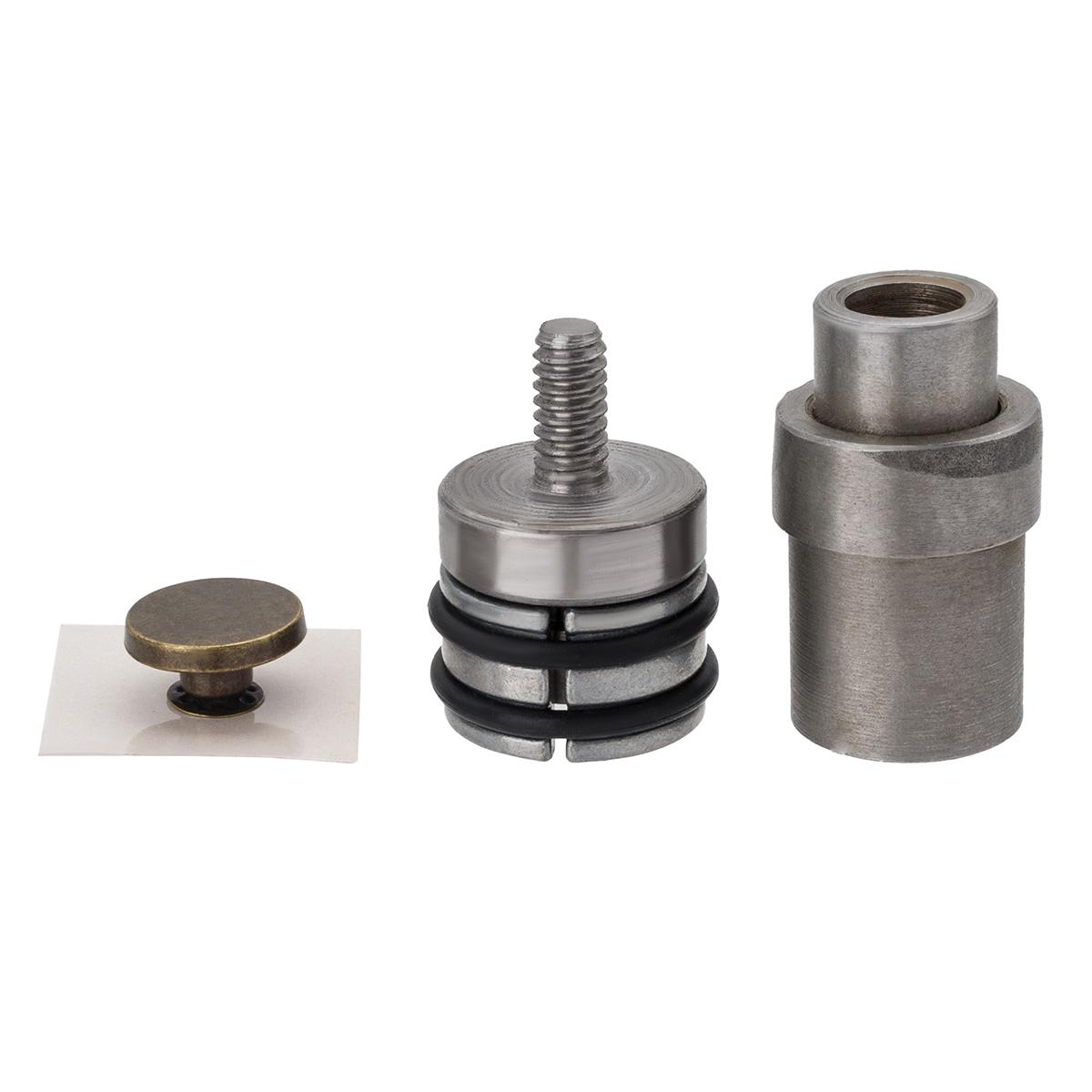 Матрица для установки джинсовых пуговиц совместима с прессами ТЕР 1, ТЕР 2, а также с другими моделями прессов, которые имеют резьбу 6 мм в нижней части подвижного штока. Конструкция насадки состоит из двух частей. Верхняя часть с резьбой вкручивается в верхнюю часть пресса. Нижняя часть - основание - устанавливается во втулку-переходник, расположенную в нижней части пресса.