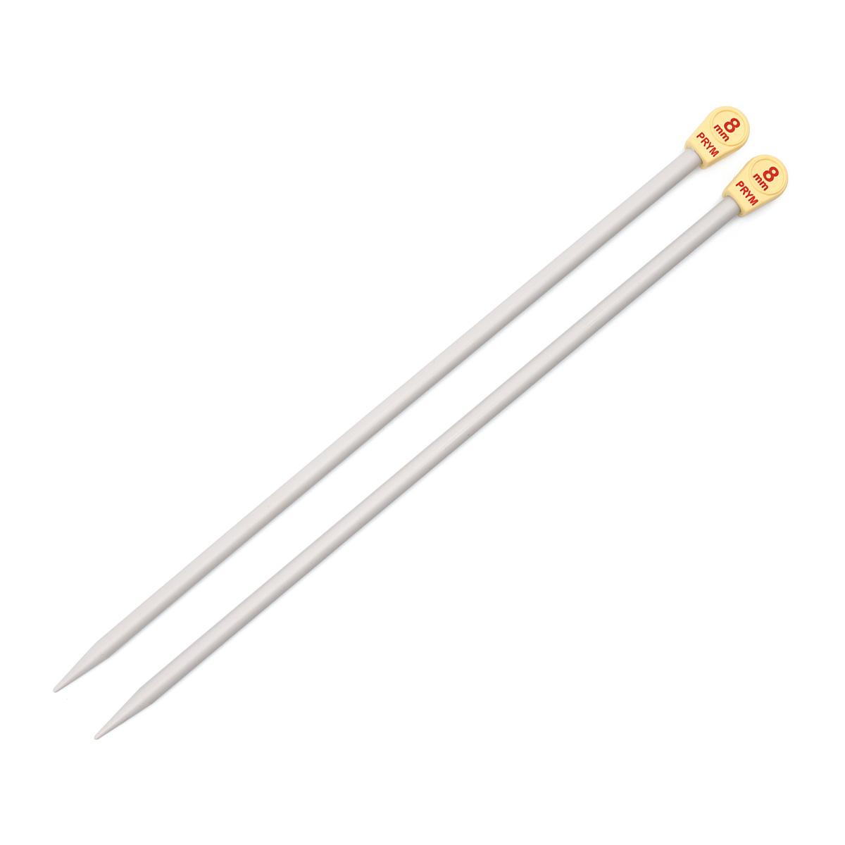 Прямые пластиковые спицы с ограничителем. Имеют достаточно большой диаметр (8 мм) и стандартную длину (35 см), идеально подходят для работы с толстой пряжей из различных материалов – акрила, шерсти, хлопка, полиэстера. Пластик – легкий и приятный на ощупь материал, спицы не травмируют пальцы, их можно доверить даже детям, не стучат при работе. Концы в форме конуса обеспечивают удобное скольжение петель.