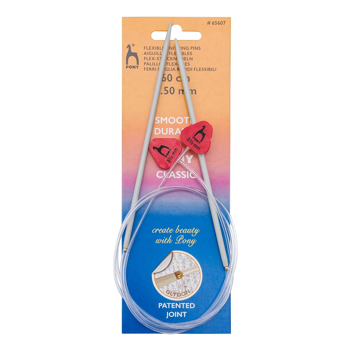 Спицы для вязания гибкие с фиксатором от Pony – это изящное сочетание легкости и прочности, залог комфортного и приятного процесса вязания. Их уникальный дизайн продуман до мелочей. Каждая спица представляет собой гармоничное соединение двух материалов: качественного алюминия и гибкого, прочного пластика.