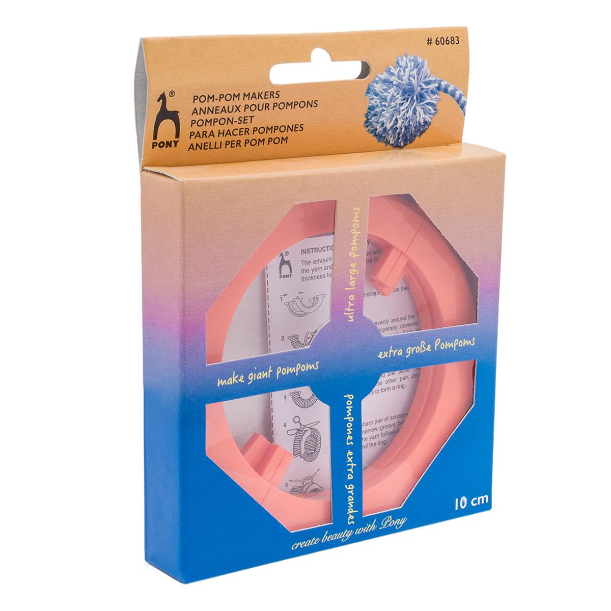 Комплект для изготовления помпонов – отличный выбор для тех, кто желает попробовать себя в рукоделии в качестве хобби. Набор Pony Pom-Pom Makers, включающий в себя 2 плоских разборных кольца диаметром 10 см, предназначен для изготовления помпонов из разных типов пряжи. Наличие ограничителей на внешней и внутренней стороне половинок позволяет формировать заготовку, задействовав одновременно несколько разных цветов или видов ниток. После намотки пряжи, детали необходимо скрепить между собой таким образом, чтобы разрезать нити ножницами по кромке было удобно, проникая лезвием в пространство между кругами. Для завершения работы с помпоном следует как можно крепче зафиксировать пучок разрезанных ниток, не извлекая его из устройства. Для придания готовому изделию пышной шарообразной формы, его достаточно встряхнуть и легкими движениями распределить направление нитей в соответствии с вашими пожеланиями.