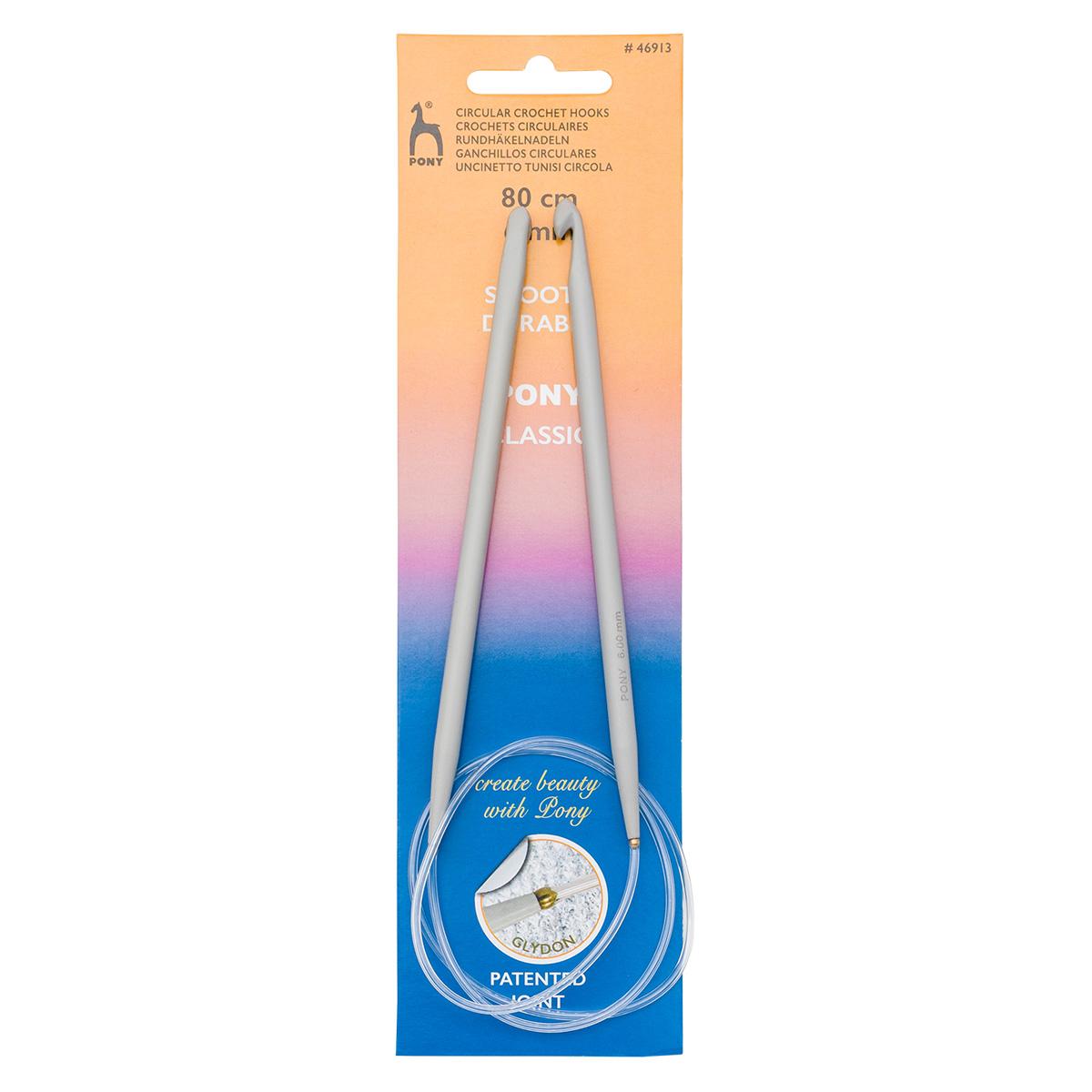 Крючки для вязания с тросиком от Pony порадуют рукодельниц своим качеством, оригинальным дизайном и удобством в применении. Крючки ориентированы на удобство при работе в тунисской (афганской) технике вязания. Два алюминиевых крючка с аккуратными головками классической формы объединены между собой гибким нейлоновым тросиком, как круговые спицы. Такая конструкция облегчает вывязывание объемных полотен с плотным узором и позволяет сократить расход пряжи. Идеально подходит для вязания различных бесшовных деталей одежды, а также носков или головных уборов.