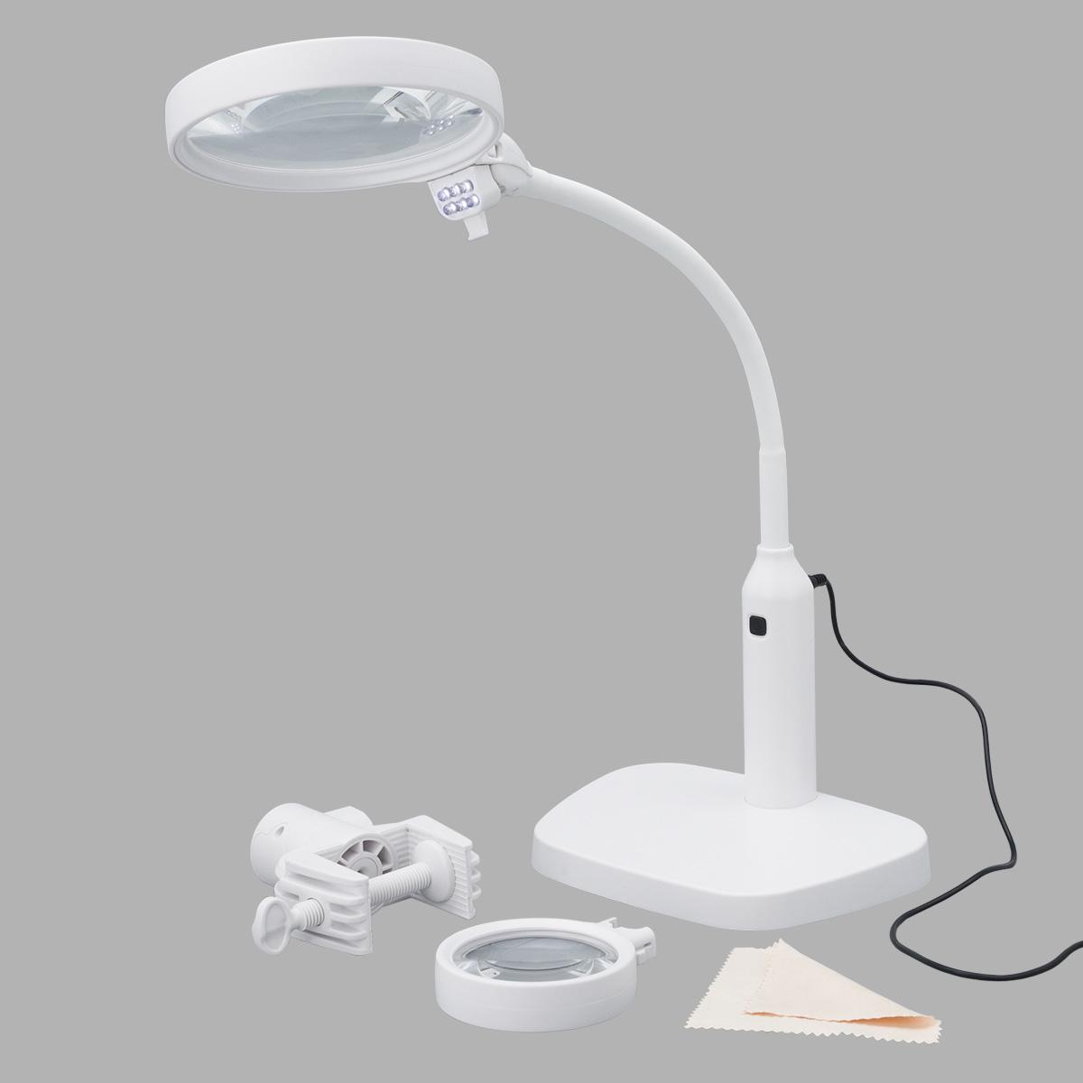 Пластиковая лупа с подсветкой имеет два вида размещения, при помощи струбцины для жесткой фиксации в районе рабочего места и имеет подставку для размещения на столе, подоконнике или другой поверхности. Штатив гнется в любой плоскости.