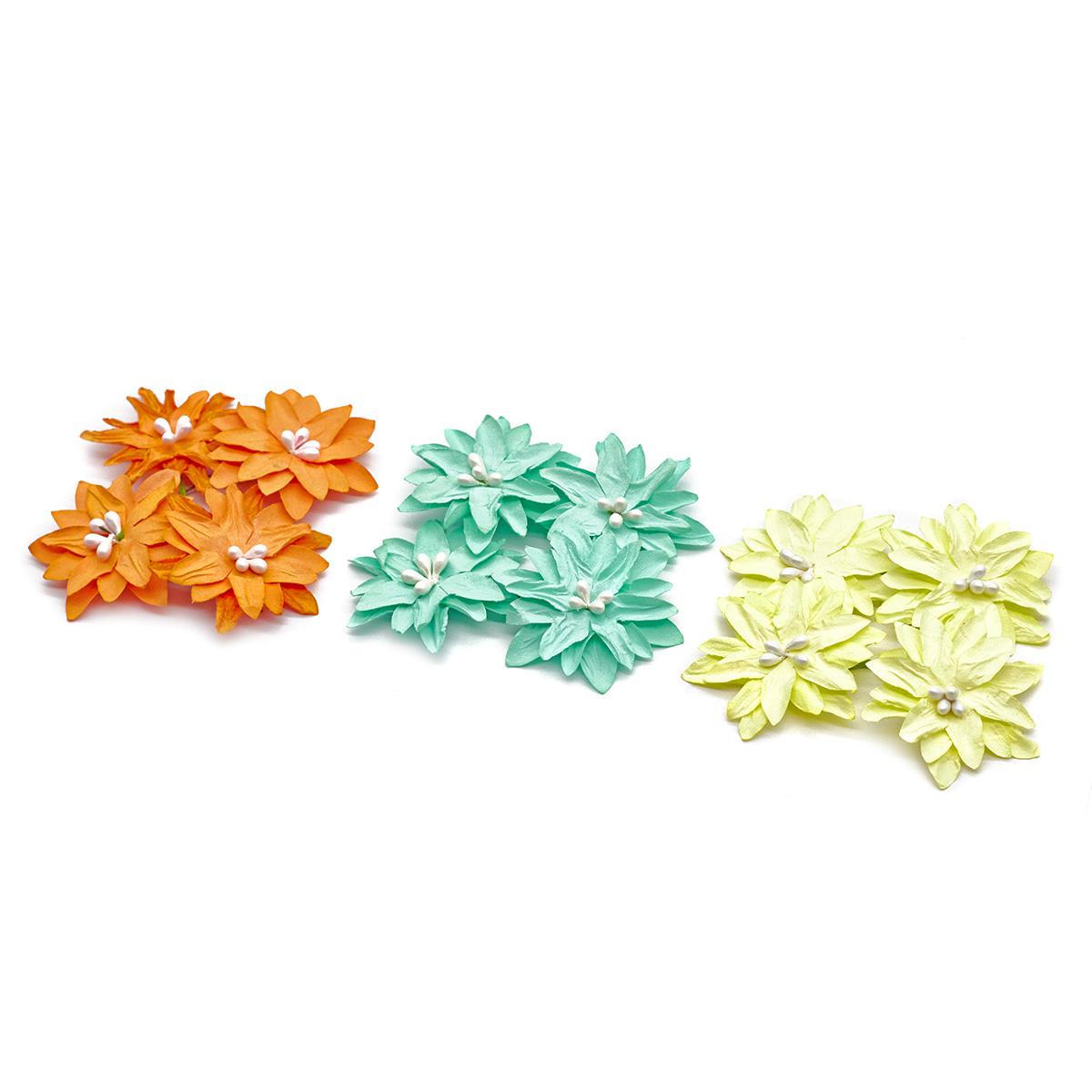 В наборе: бумажные цветы ромашки, диаметр 5 см, цвета: оранжевый, голубой, кремовый. Всего 12 шт.